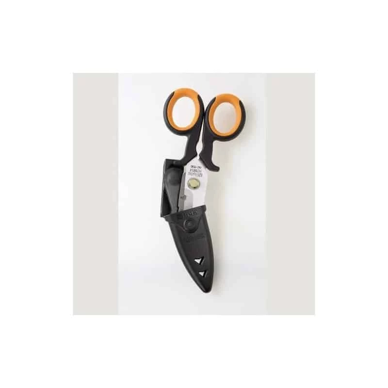 Ciseaux d’électricien avec profils à fraise graduée avec étui. Conçus pour élargir les trous sur les boîtes de dérivation en plastique et fermer les tuyaux plissés. Etui articulé accrochable à la ceinture. Branches bi-matières. Axe anti-desserrement. Système Breveté.