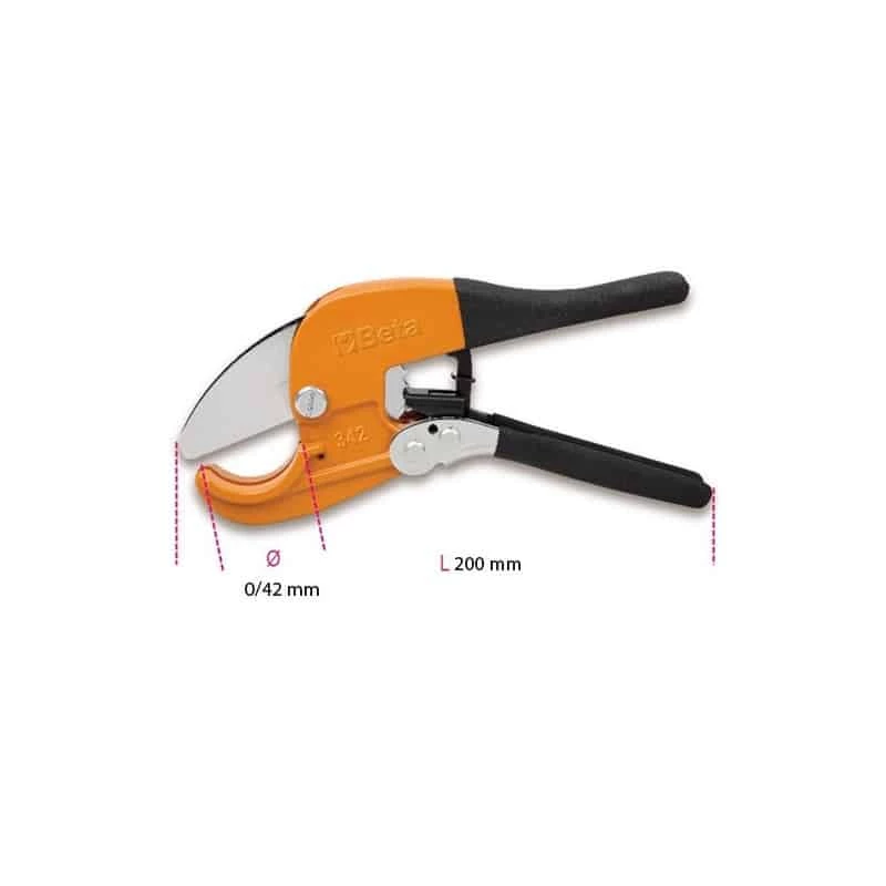 Beta : Coupe-tubes PVC à cliquet pour tubes en plastiques d’un diamètre de 42 mm maximum .