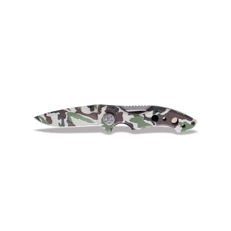 Le couteau à cran d’arrêt Beta 1778CM possède une lame en acier trempé très résistante et un manche en aluminium le tout recouvert d’un motif camouflage. Il est également équipé d’un clip pour ceinture et est fourni avec un étui de rangement lui même montable sur ceinture.