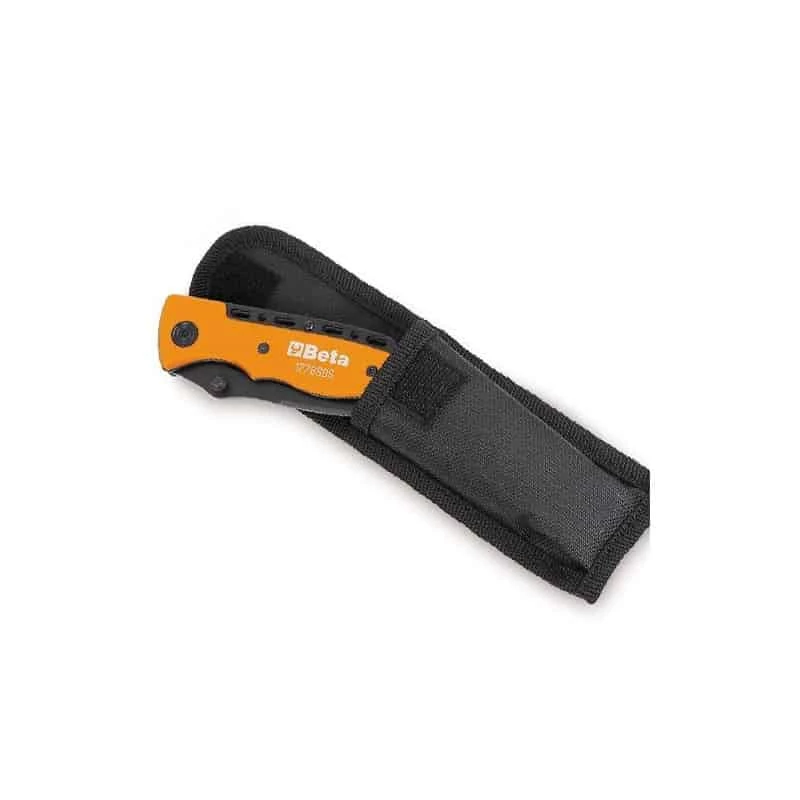 Ce couteau possède un clip de fixation à la ceinture et un étui en tissu avec passe-ceinture.