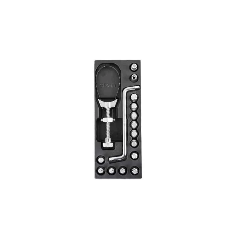 Assortiment de 15 douilles, carrées, mâle 6 pans, mâle carré, mâle triangulaire pour bouchons de vidange moteur et une massette à embouts plastiques, le tout présenté sur plateau.