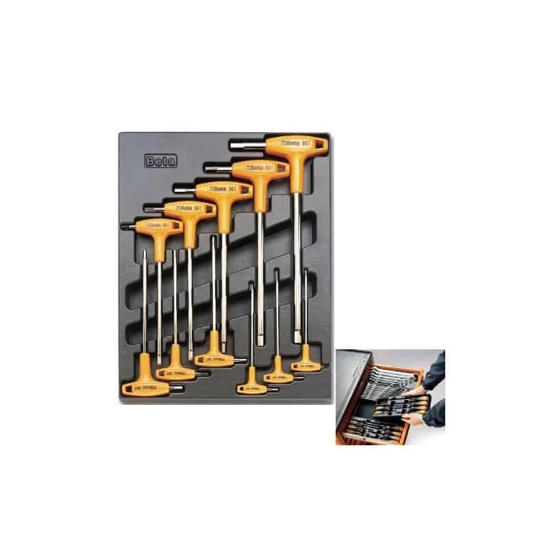 Plateau thermoformé rigide avec composition d’outils, clés mâles 6 pans à poignée en forme de T. Détail de cette composition: 2 – 2,5 – 3 – 3,5 – 4 – 4,5 – 5 – 6 – 7 – 8 et 10 mm