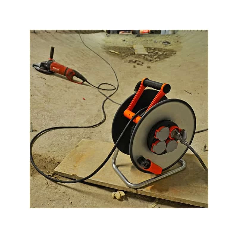 Enrouleur de câble 33 mètres Brennenstuhl Steelcore 9192331100 avec disque isolant IP 44. Ses flasques en acier galvanisé avant et arrière sont entièrement isolées pour une protection d’utilisation sur les chantiers. les 4 prises de courant sont protégées contre les projections d’eau grâce aux clapets à fermeture automatique. Le voyant de tension vous indique directement quand l’enrouleur est sous tension.