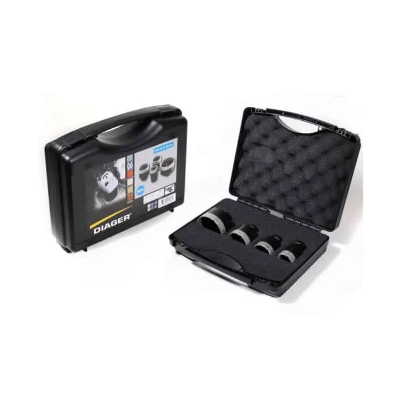 Cette mallette comprend 4 scies trépans diamants Diager utilisables avec une meuleuse d’angle M14 ou une perceuse via un connecteur et un pilote, grâce au système OneHand.
