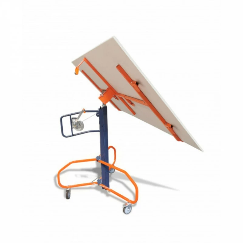 Le treuil possède une poignée bi-matière. La poignée de basculement est ergonomique pour faciliter le chargement de la plaque. Grâce à ses pieds latéraux pliables, le passage de porte est plus facile. Le lève plaque, possède 3 roues dont 2 frein et 2 roulettes de stabilisation/transport.