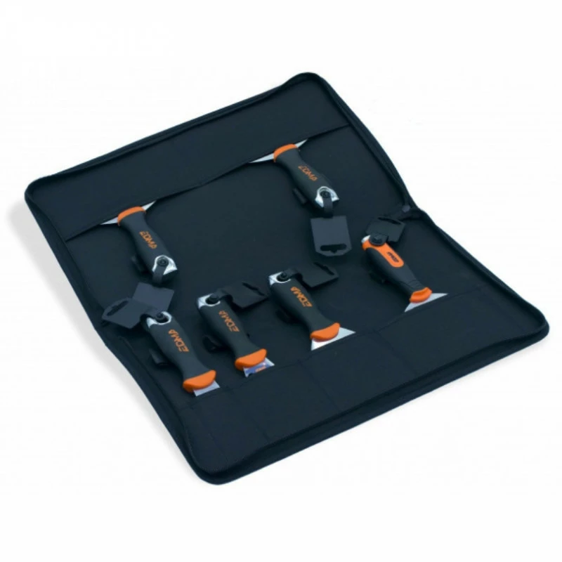 La sacoche de rangement de couteaux à enduire est en nylon. Elle possède 6 inserts et possède une poignée pour le transport. Le système de fermeture de celle-ci est par zip.