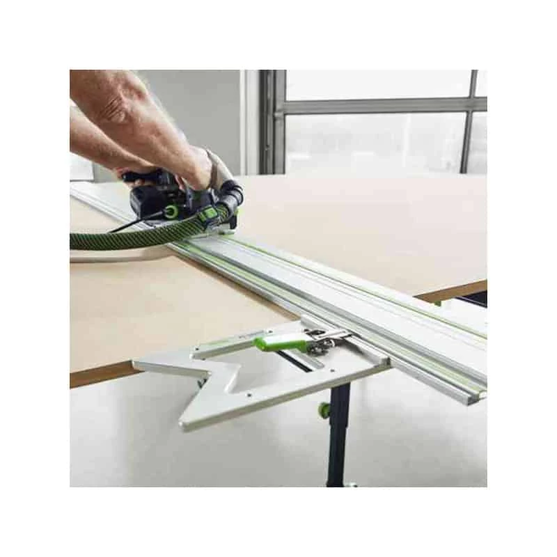Installation simple : À insérer dans le rail de guidage ; rabattre ensuite le levier de serrage rapide. Pour une coupe à 90° précise et répétable.