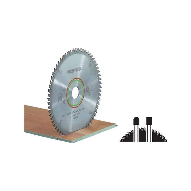Lame de scie spéciale pour le traitement de plaques stratifiées, panneaux laminés, panneaux en résine mélamine, matières minérales ainsi que fibres à liant résine phénolique et tissu.