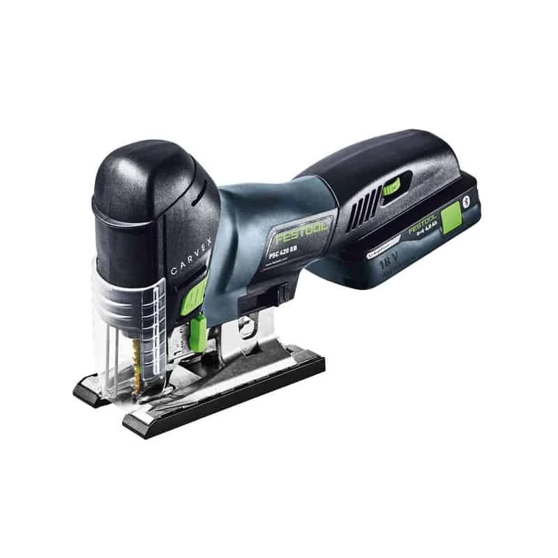 Idéale pour le sciage de bois et de matériaux similaires, la scie sauteuse sans fil Festool PSC 420 EB est équipée d’un puissant et efficace moteur sans charbons EC-TEC pour une cadence de travail rapide et un sciage tout en puissance avec 3800 courses par minute.