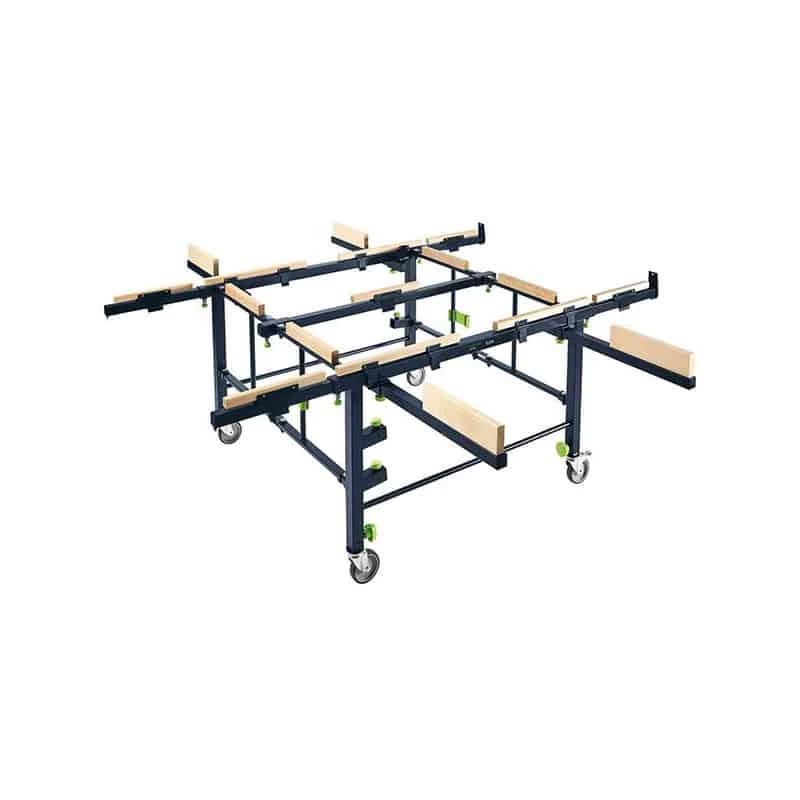 La table mobile STM 1800 Festool est utilisable comme table de sciage à l’atelier ou sur le chantier ; découpe et usinage de panneaux et de pièces à usiner.