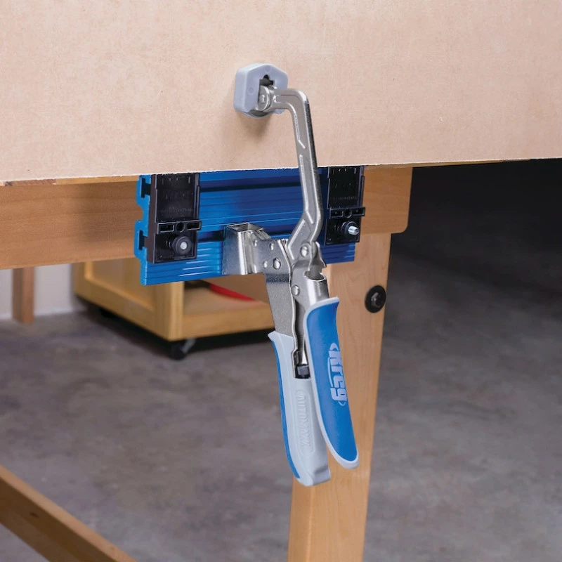 L’outil est équipé de la technologie Automaxx® qui permet à la pince de s’adapter toute seule aux différentes épaisseurs de matériaux. Pour activer le système, il suffit d’effectuer une simple pression sur les poignées. De plus, la pince peut contenir jusqu’à 180 kg de pression. L’outil est compatible avec toutes les surfaces de travail de 25-51mm d’épaisseur et fonctionne les autres produits KREG Clamp Trak et Clamp Plate.
