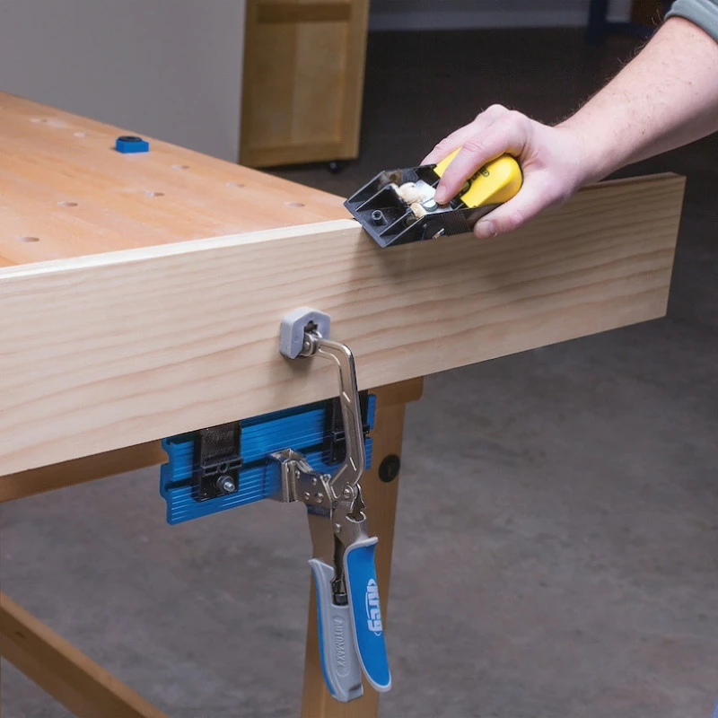 L’étau à pince de Kreg est polyvalent pour les projets bois. Il s’agit de l’outil idéal pour serrer des pièces sur le bord soutenu par des blocs de serrage réglables avec 7 réglages de hauteur. C’est la solution parfaite pour les travaux de ponçage et rabotage.