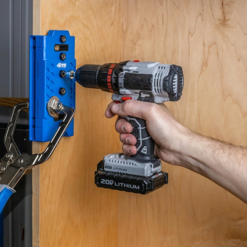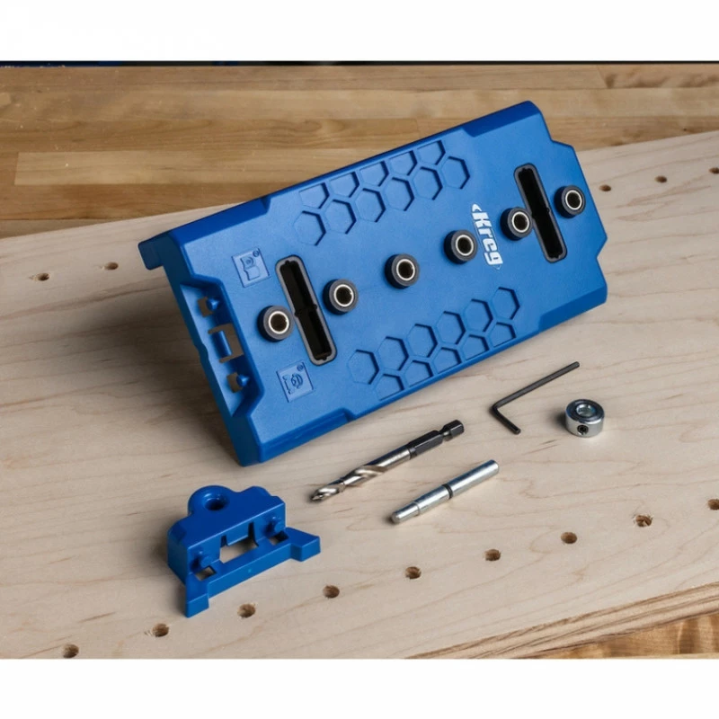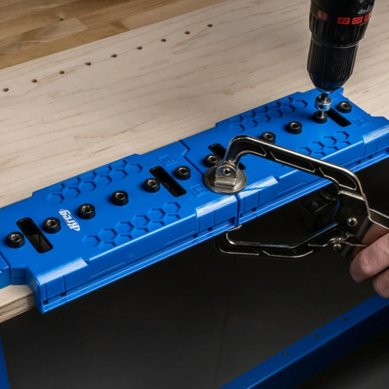 Cet appareil simplifie l’installation de charnières dans les étagères en créant des trous de goupille à la profondeur parfaits avec des guides en acier trempé.