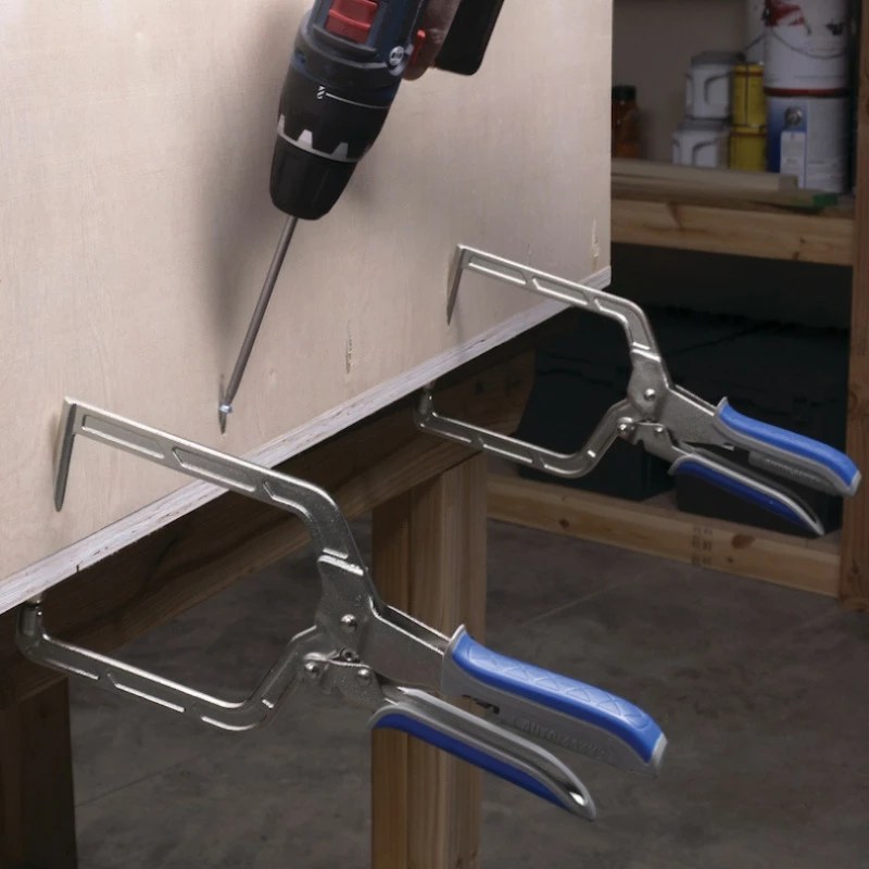 Le serre-joint à angle droit de Kreg permet de tenir les pièces de 79 mm de largeur maximum dans une position de 90° pour effectuer des vissages. Équipé de la technologie Automaxx®, le serre-joint se ferme automatiquement avec la pression de serrage réglée. Le serre-joint se règle donc à l’épaisseur des pièces pour une portée de 127mm. Pour l’assemblage de grandes pièces, les spécialistes du métier utilisent 2 pinces. En effet, une de chaque côté pour maintenir le bois pendant le perçage.
