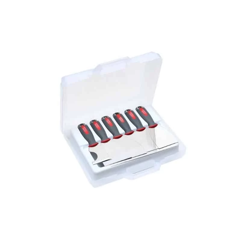 Pour enduire les joints des plaques de plâtre et la pose de bandes, L’Outil Parfait propose un kit de 6 couteaux dont un 6 en 1.