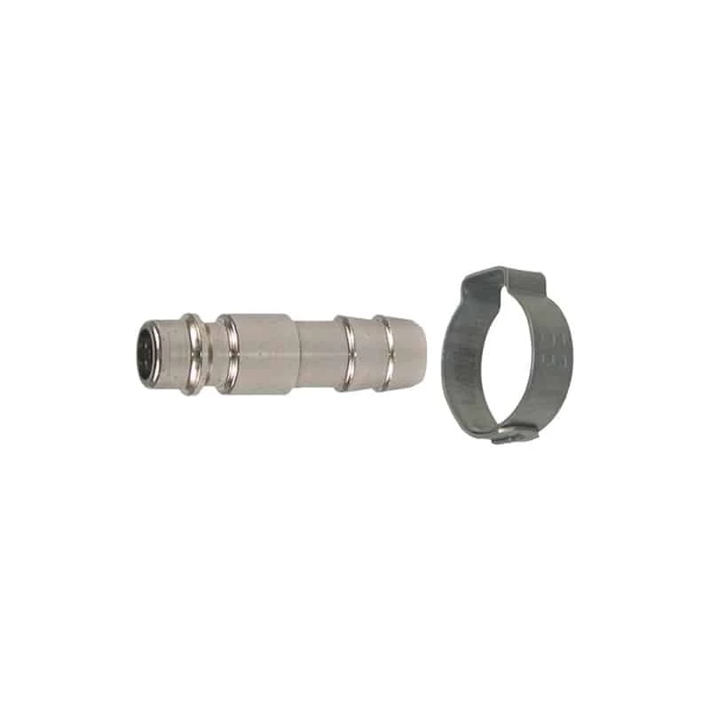 Embout raccord rapide gros débit – Passage Ø 7,2 mm en acier trempé Lacmé 365 200 – Cannelé pour tuyau Ø int. 10 mm – Livré avec collier de serrage.