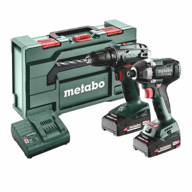 Le pack 2 outils 18V METABO est composé d’une visseuse à choc sans fil SSD 18 LT 200 BL, d’une perceuse-visseuse sans fil BS 18, de 2 batteries avec un chargeur et d’une caisse de rangement 145L.