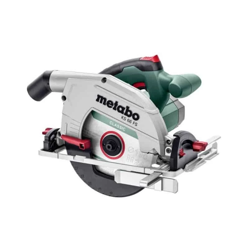 Fournie avec un coffret metaBOX, la scie circulaire portative Metabo KS 66 FS est utilisable directement sur des rails de guidage FS ou KFS de Metabo et d’autres fabricants pour des coupes longues et précises.