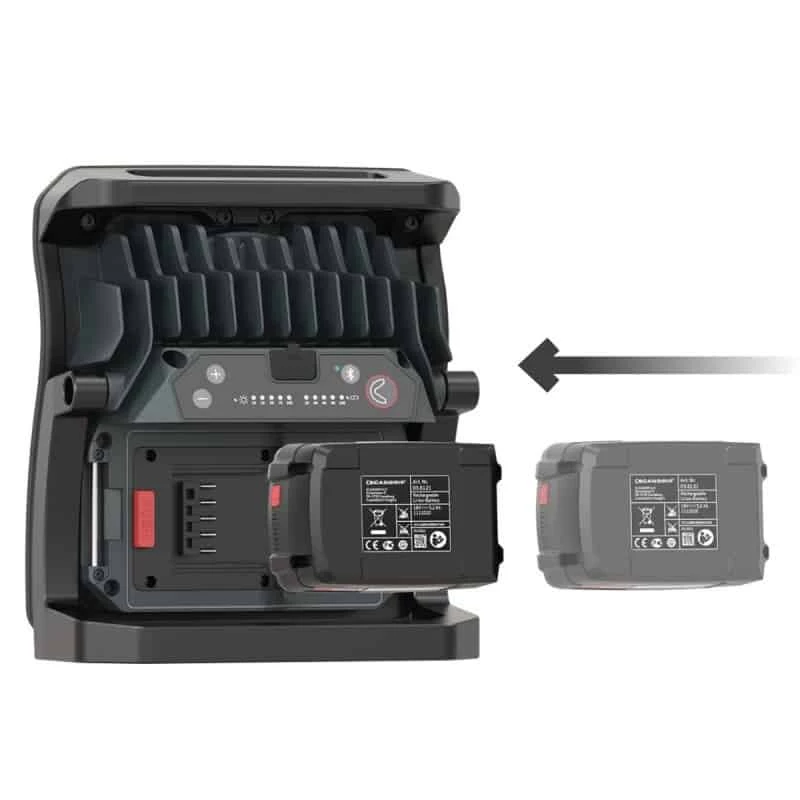Livrée avec une batterie METABO/CAS 18V 5,2 Ah, le « convertisseur de lampe CAS en modèle filaire » (non fourni) peut aussi être installé sur la lampe pour une lumière illimitée. Si vous n’avez plus de batterie et pas d’accès secteur, la batterie de secours interne permet d’obtenir 1 heure supplémentaires à 1000 lumens.