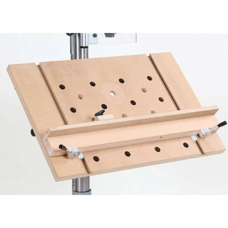 Pour la table en bois, elle est rectangulaire 600 x 300 mm, inclinable et orientable dans les 2 sens, une règle d’appui avec mollette de serrage, un rond central amovible pour le perçage en profondeur, une butée latérale avec molette de serrage et enfin la table est trouée pour l’utilisation de sauterelles pour le serrage des pièces.