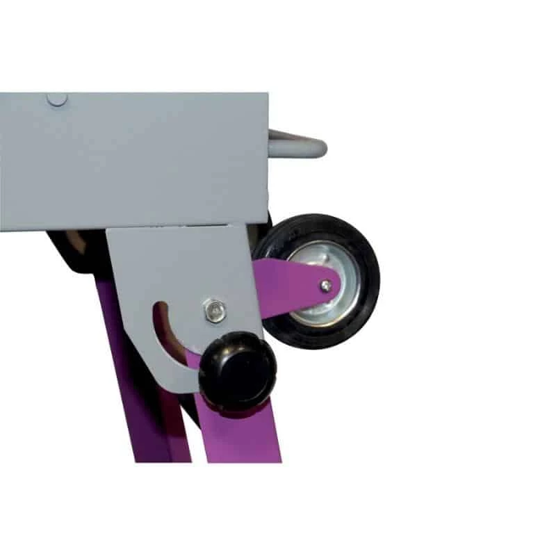 Afin de faciliter le transport de la machine, la scie est équipée de pieds repliables et d’un bâti qui est doté de roues de transport.