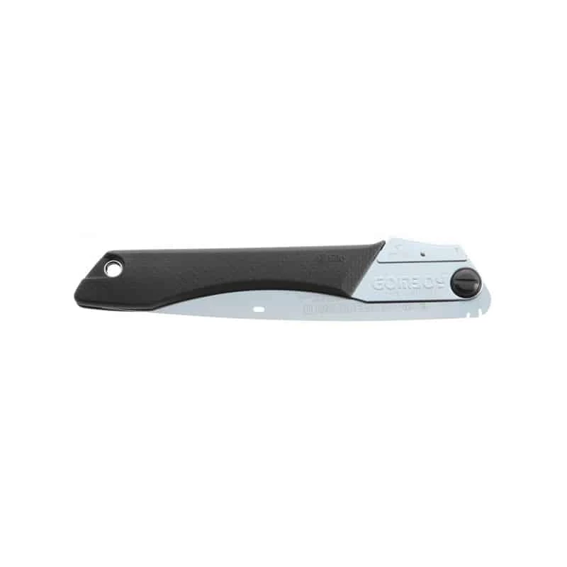 La poignée en caoutchouc de la Gomboy assure une bonne prise en main confortable. Le trou de la poignée permet de passer un mousqueton ou corde à la scie.