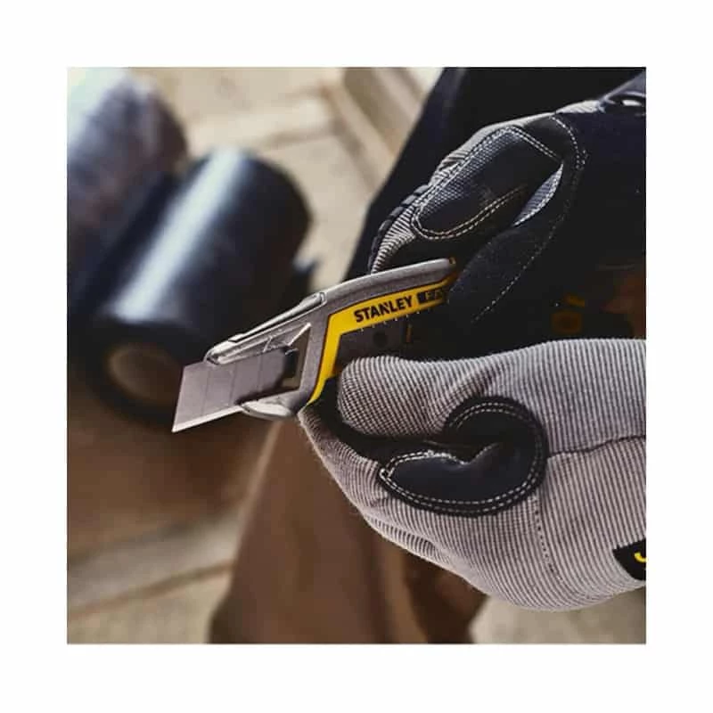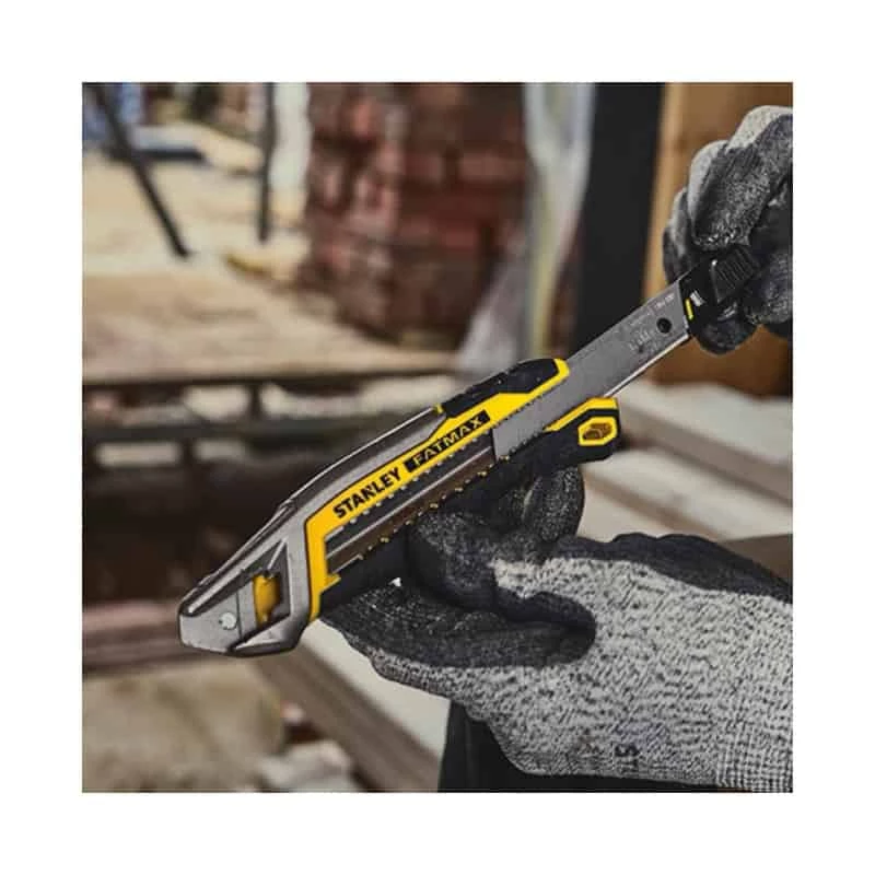 Le cutter 18 mm Quick Snap Fatmax Stanley est doté d’un mécanisme casse-lame qui permet d’avoir une lame toujours tranchante rapidement, facilement et en toute sécurité. Plus besoin d’utiliser un autre outil pour casser la lame. Lorsque la lame est émoussée, il suffit de placer le haut de la lame le long de la ligne symbolisant le bon emplacement et d’actionner le mécanisme casse-lame. Le segment usagé est alors cassé instantanément et un aimant vient le retenir pour éviter les blessures.