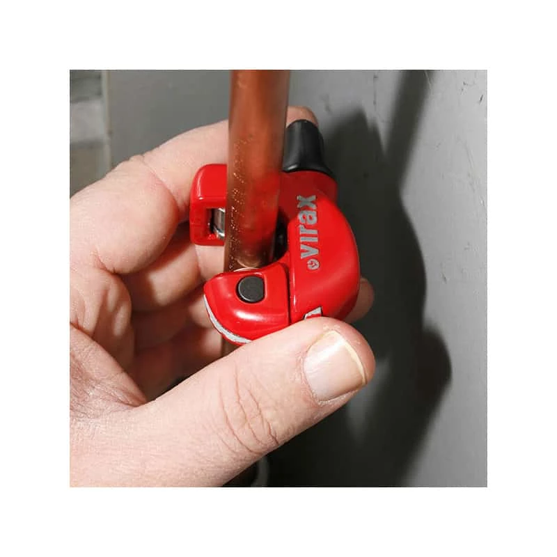 Mini coupe-tube Virax idéal pour couper des tubes dans des endroits exigus : sous les lavabos, entre 2 tubes, le long d’un mur.
